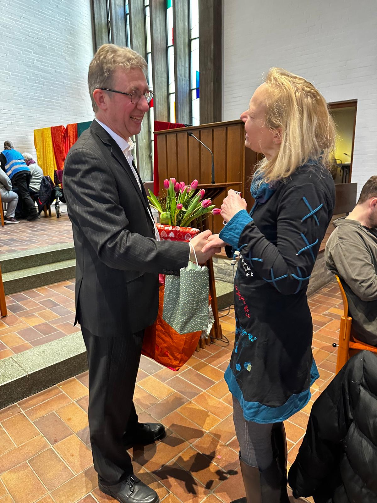 Am Sonntag, 22. Februar verabschiedeten wir Pastor Friedrich Degenhardt in der evangelischen Johanniskirche an der Bremer Straße nach 10 Jahren Wirkzeit. In all den Jahren lag sein Hauptaugenmerk unter anderem auf dem Einsatz für Bedürftige und der ökumenischen Zusammenarbeit. Nun zieht er weiter und übernimmt eine halbe Pfarrstelle im Kirchenkreis Hamburg-Ost zur Unterstützung der interkulturell geprägten Arbeit der Martin-Luther-King-Kirchengemeinde in Steilshoop. "Mit einer zweiten 50%-Stelle werde ich im Vertretungspfarramt viele weitere Orte und Engagierte im Kirchenkreis Hamburg-Ost kennenlernen." (Apostelnews 30. Januar 2026). Für seine neuen Aufgaben wünschen wir ihm viel Kraft, Kreativität und viele gute Begegnungen. Gott segne ihn und seine Familie auf dem neuen Weg.